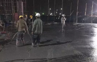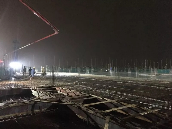 零时整,现场负责人下达”开始浇灌”指令,施工现场开始进行浇灌水泥,长长的浇灌管道从天而降,技术人员在仔细地指挥着,各职能小组组长带领班组作业人员,对作业面进行仔细全面的排查,杜绝浇灌不均、作业面不平整的情况出现。