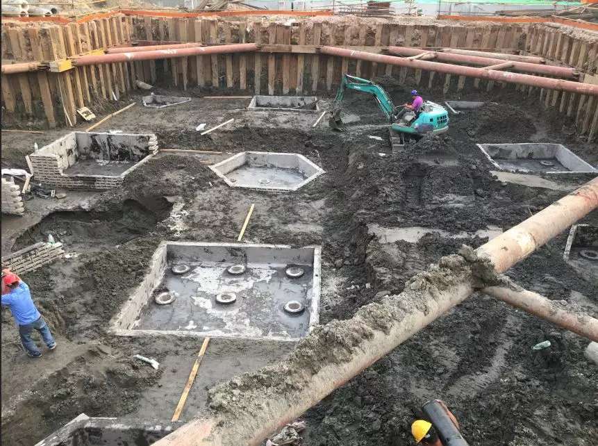 针对地下水丰富及场地受限制条件,地下室采用整体开挖四周用钢板桩支护,同时严格控制施工的时间,圆满保障了施工安全与施工要求。