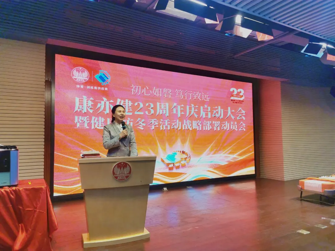 作为康亦健的战略伙伴,国家体育总局训练局副局长周秋瑞亲临会议现场,并对康亦健 23 周年表达了热烈祝贺。她表示:“康亦健多年来始终致力于中国体育,为推动体育事业的发展做出了积极贡献。在过去的合作中,我们见证了康亦健的成长与进步,也看到了他们为提升全民健康水平所付出的努力。值此 23 周年之际,我代表国家体育局训练局,向康亦健表示最诚挚的祝贺,祝愿康亦健在未来的发展中取得更加辉煌的成就!”