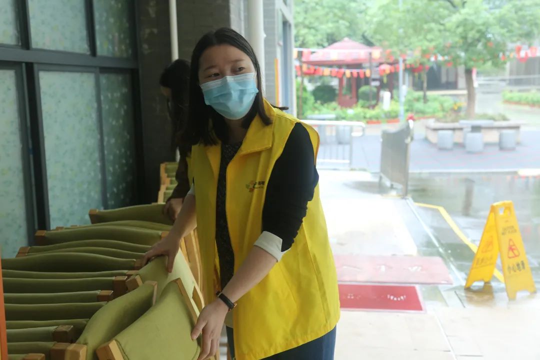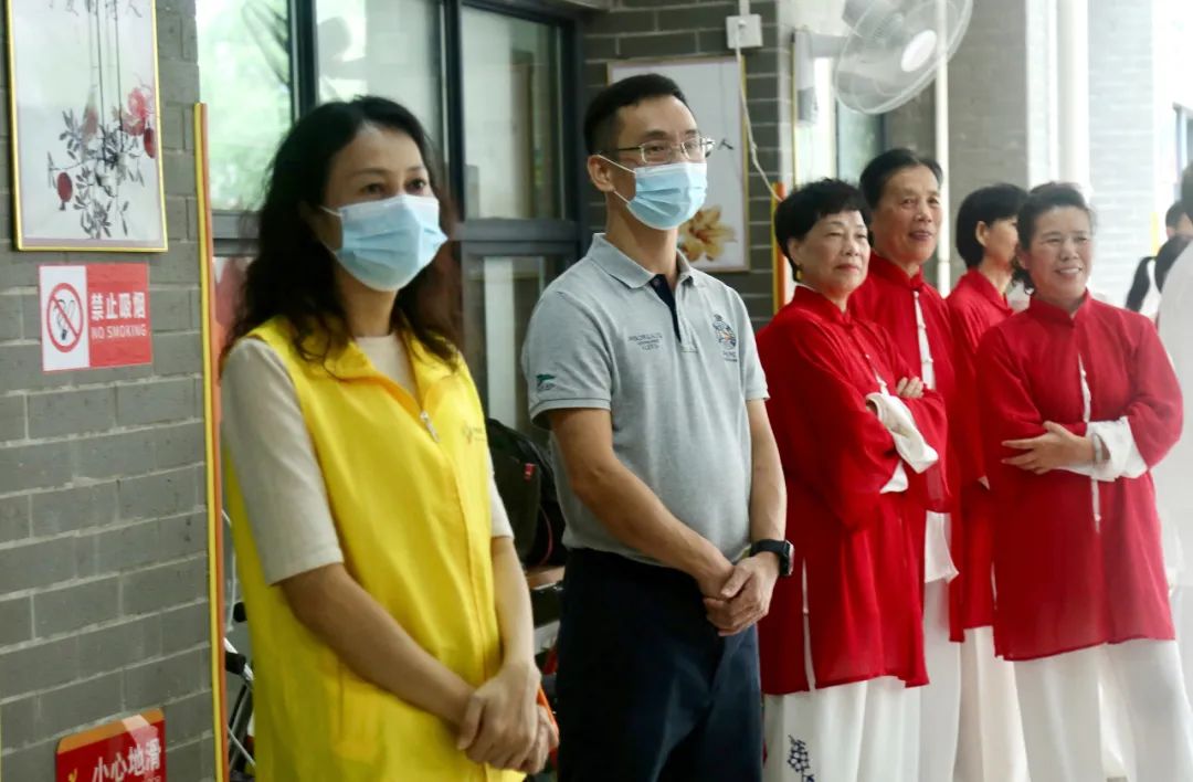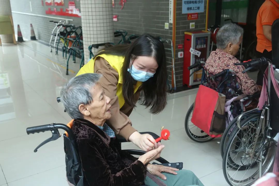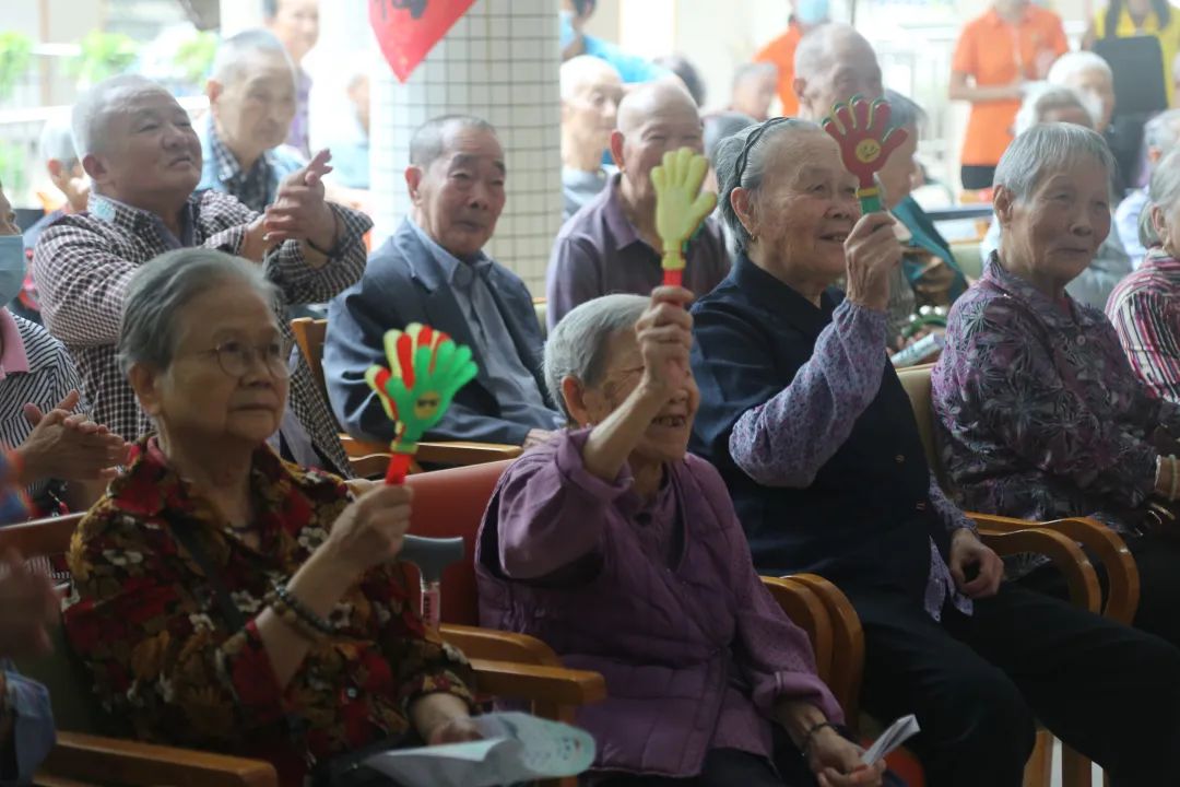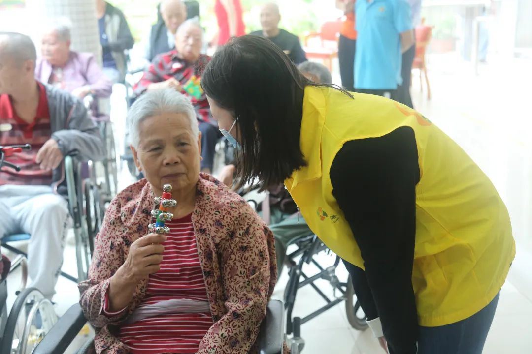 活动现场,志愿者们不仅要维持活动现场秩序,带长者观看节目、摆放现场椅子,还与现场长者们亲切互动,陪伴他们度过一个安全快乐的重阳时光。